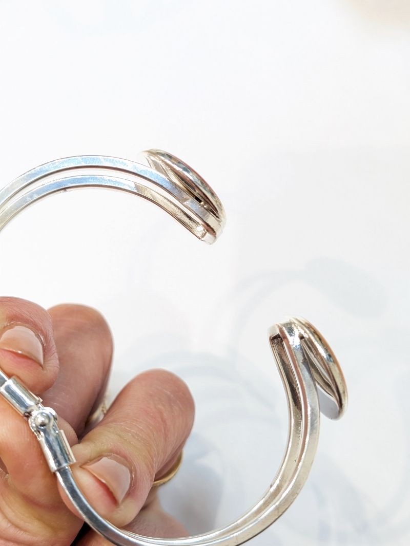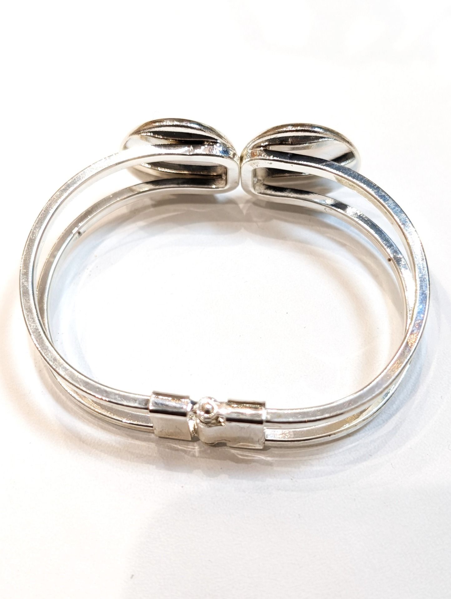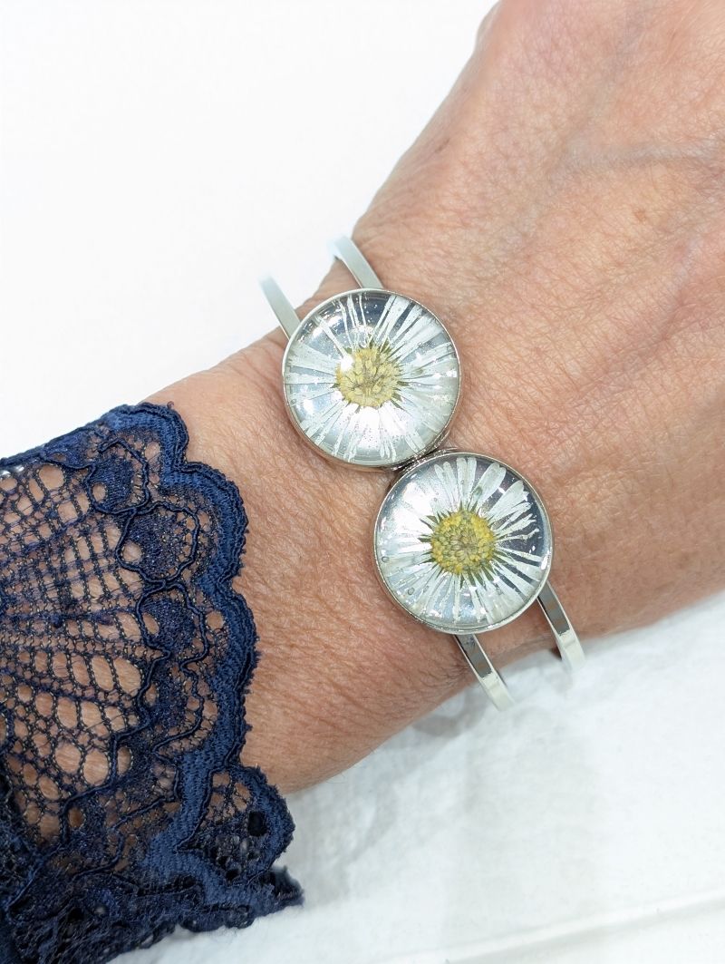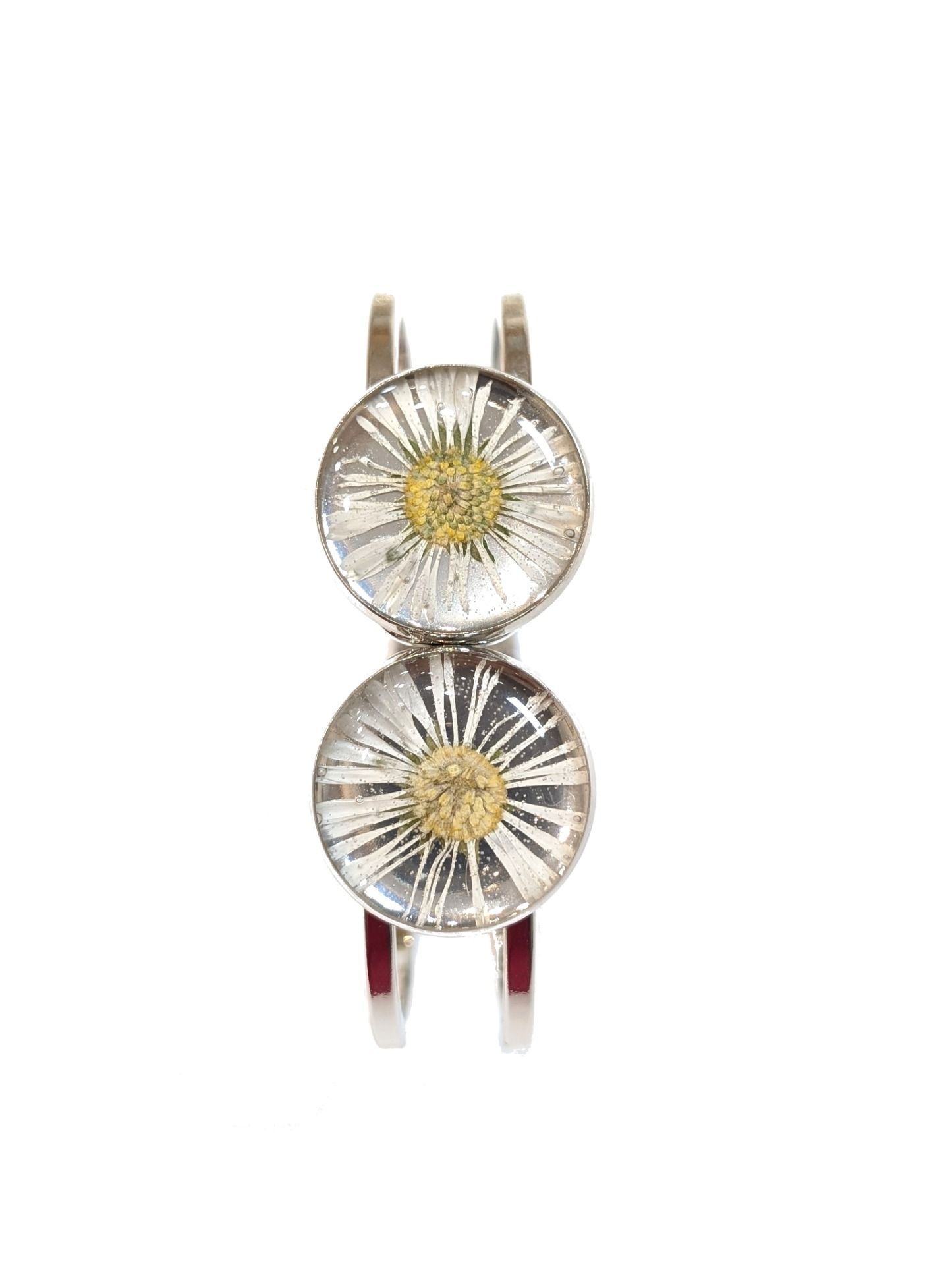 Bracelet jonc double articulé en métal argenté réalisé avec deux véritables fleur Pâquerette