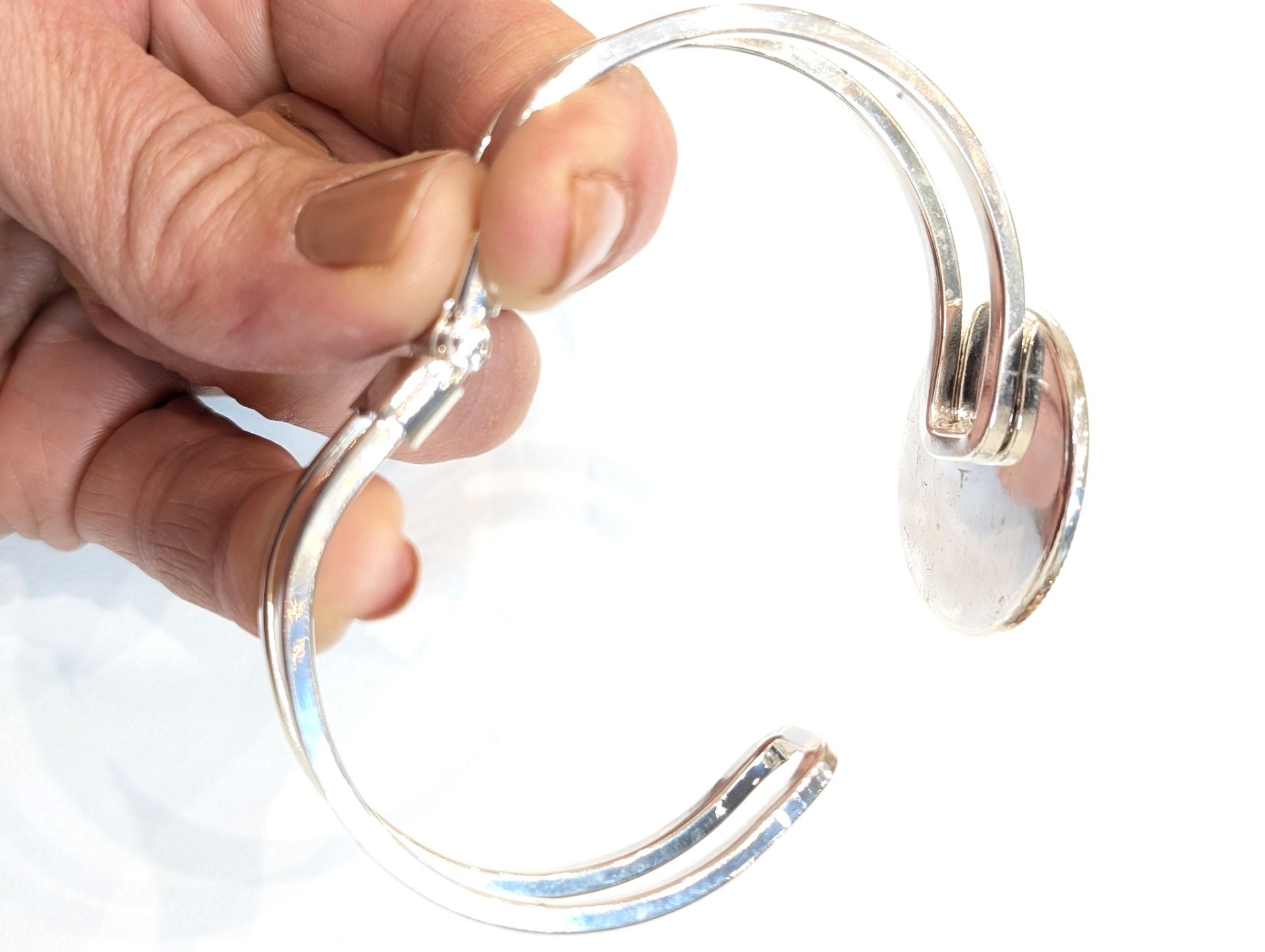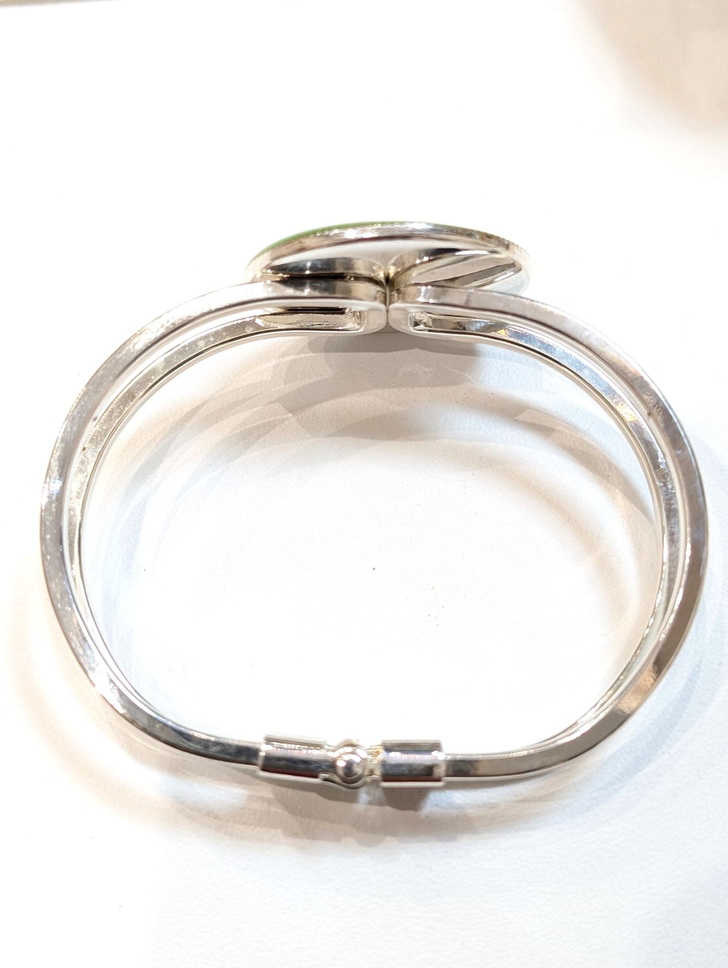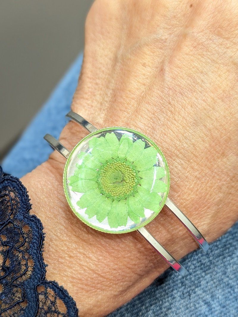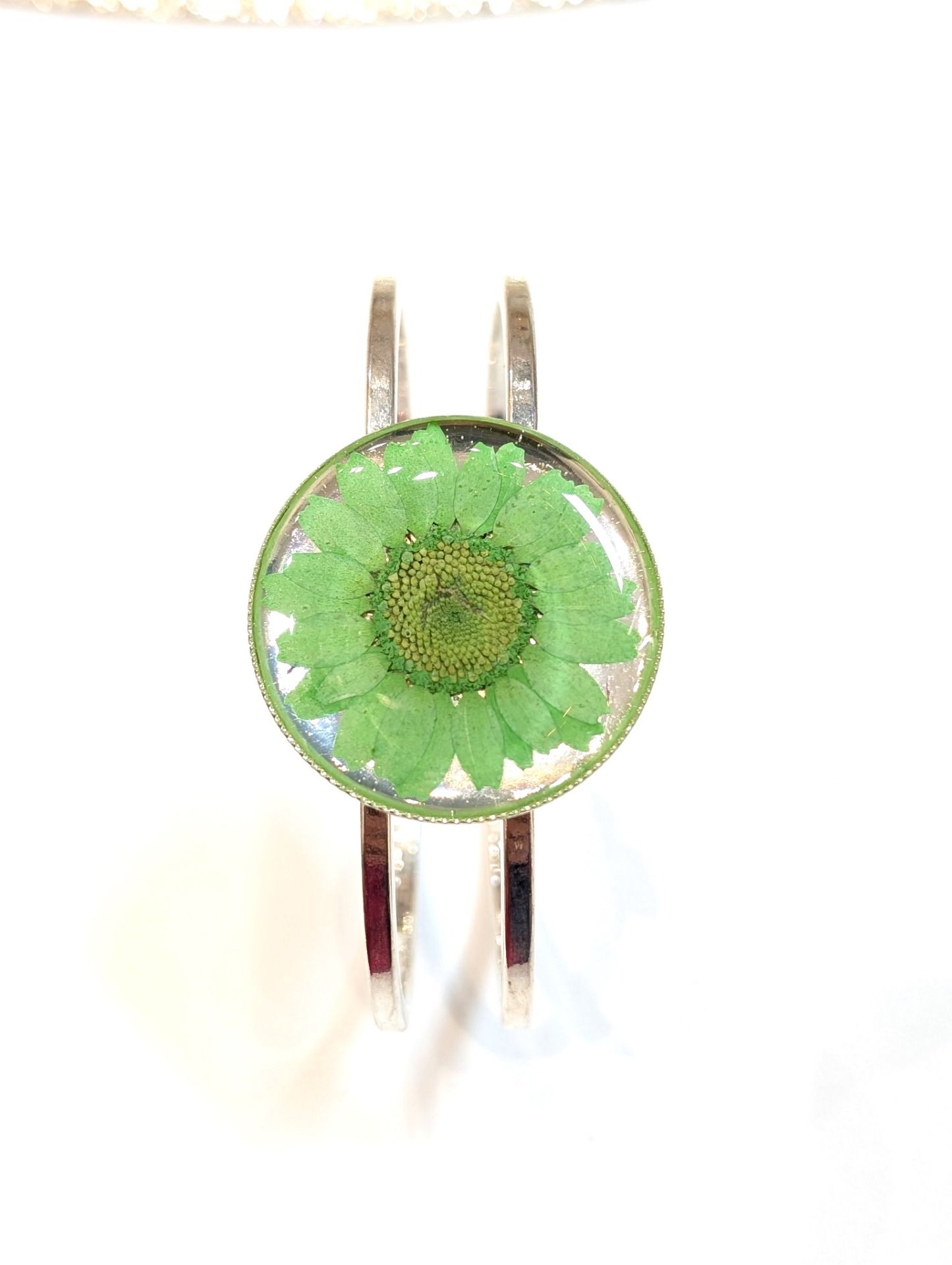 Bracelet jonc articulé en métal argenté réalisé avec une véritable fleur Marguerite teintée vert pressée et figée dans de la résine coulée directement sur le plateau du jonc