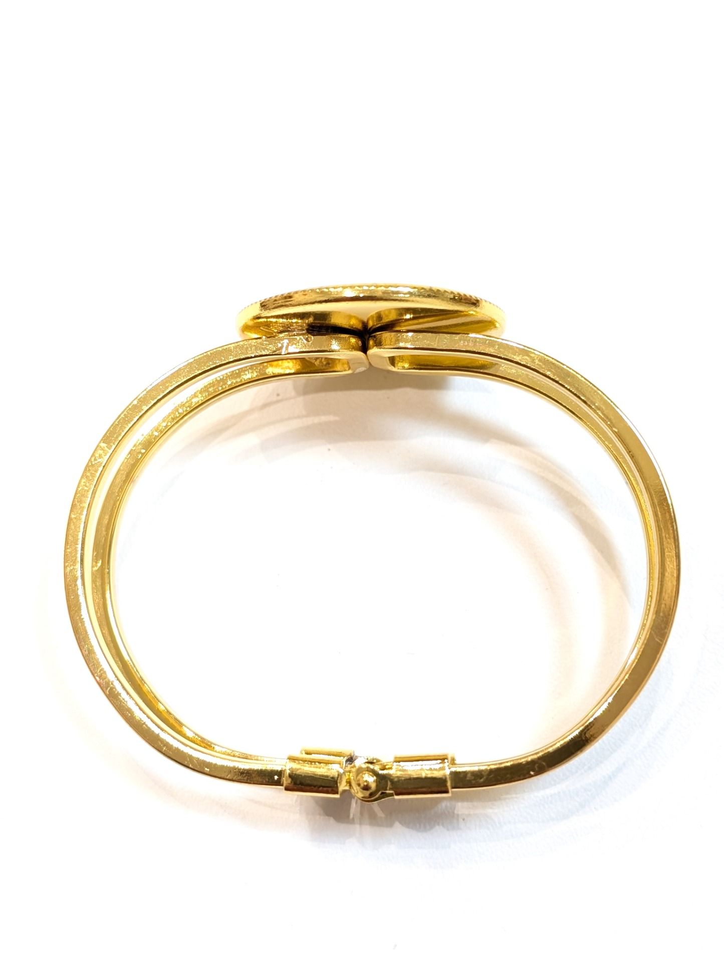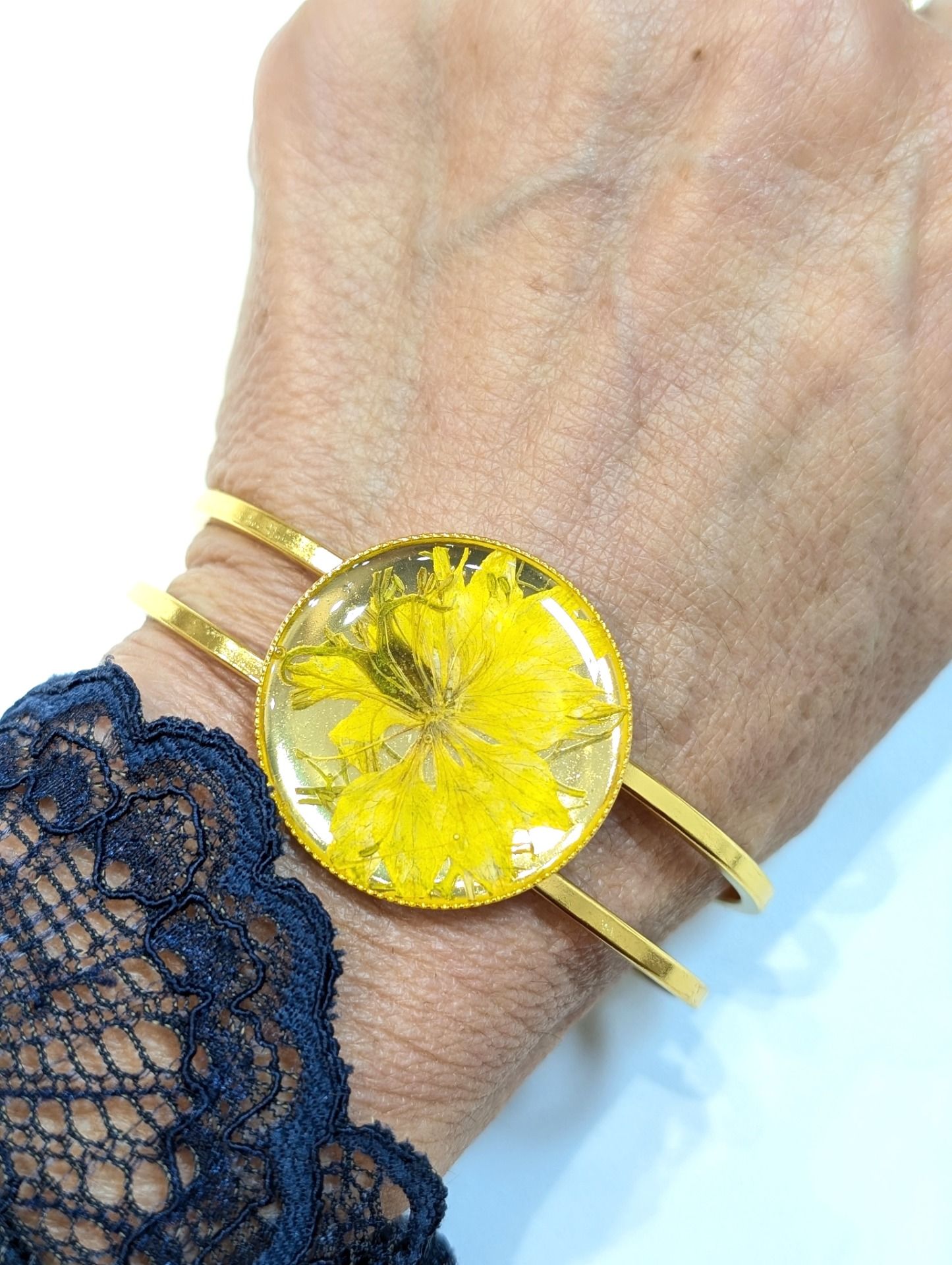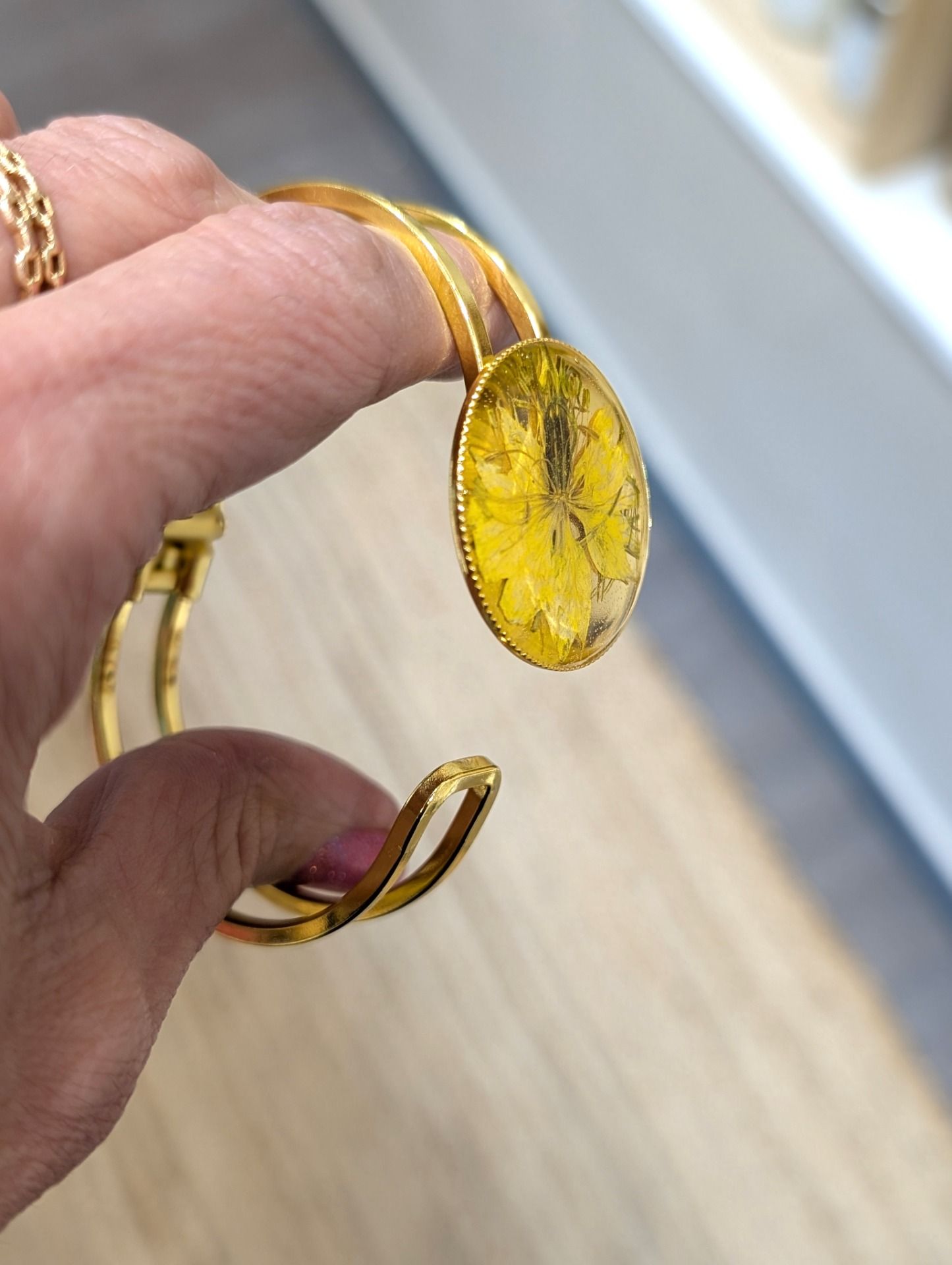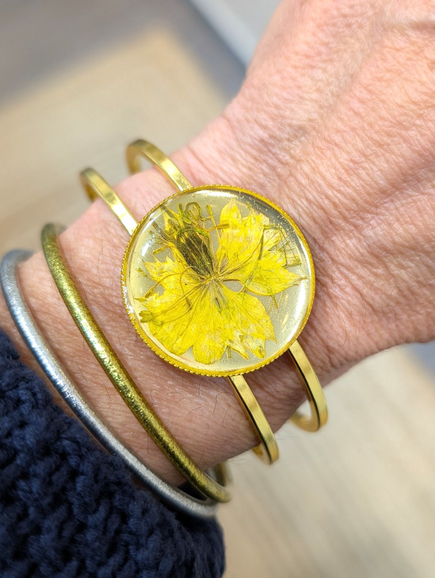 Bracelet jonc articulé métal doré réalisé avec une véritable fleur de Nigelle jaune